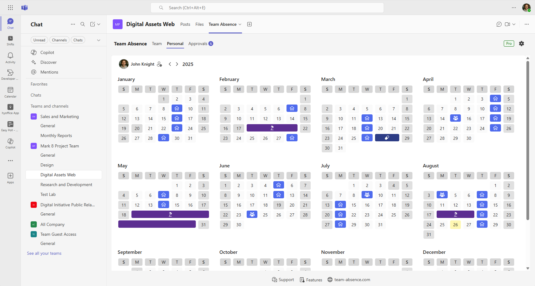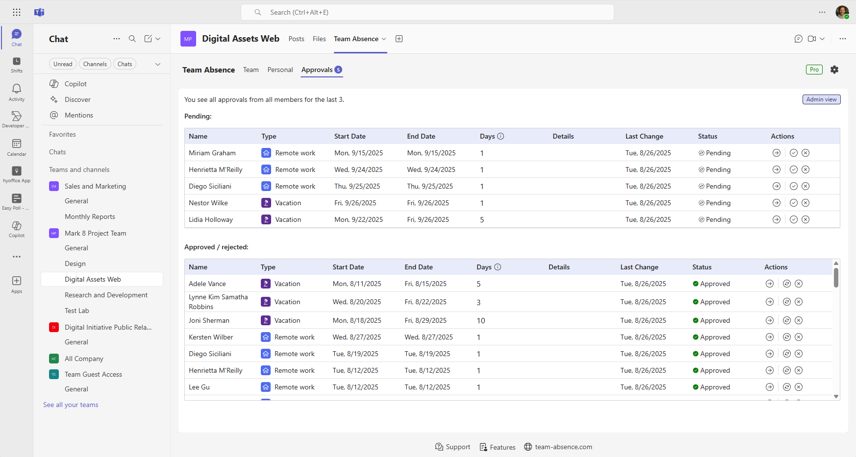 No Account Needed: Easily see who’s off and when — right inside Microsoft Teams. No sign-up or external accounts needed. Launch the app directly in Microsoft Teams and start managing absences right away.