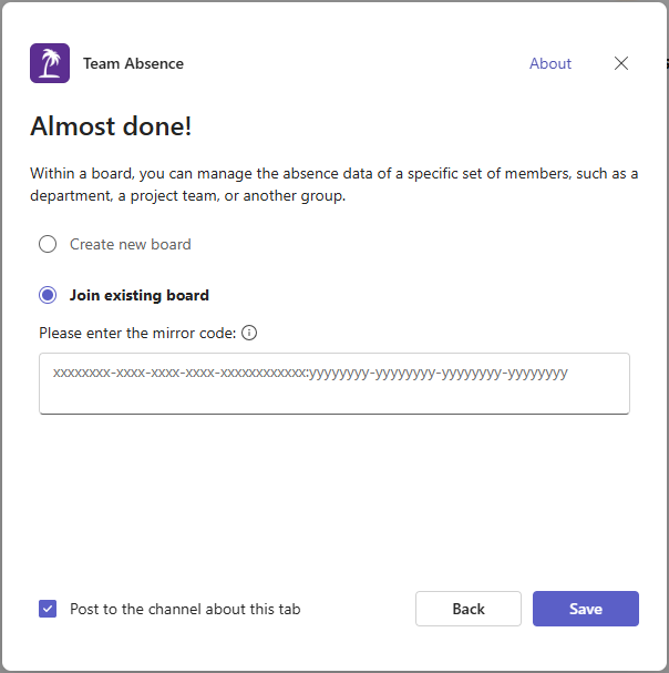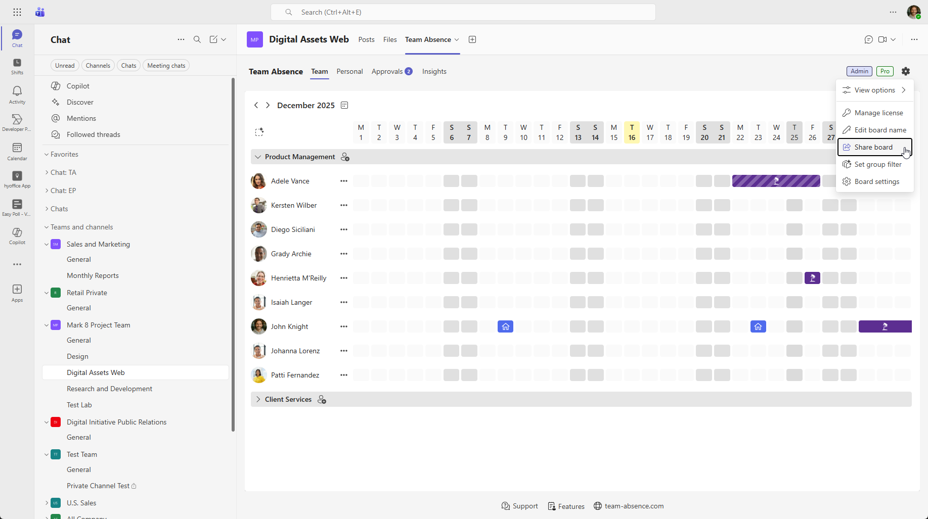 Install Team Absence in the Microsoft Teams channel where you want to reuse the board.